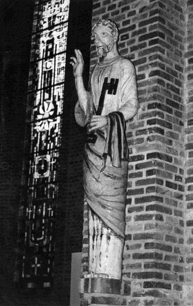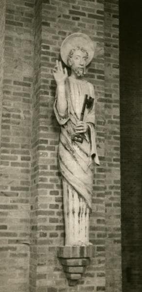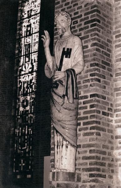 saint Louis, couronne, bouclier, main de justice, épée, Vierge à l'Enfant, saint Joseph, hache, tronc, saint Pierre, clé