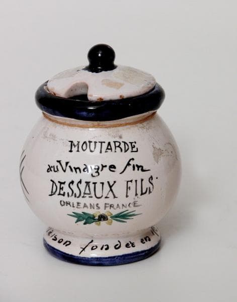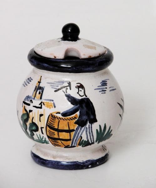 Moutardier en terre cuite émaillée, moulé par versement de la terre liquide dans un moule. Il est pansu, à couleurs sous couverte, et muni d'un couvercle à bouton de préhension bleu.
