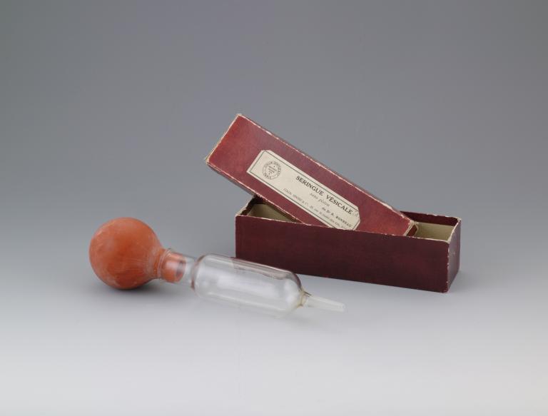 Sur le couvercle de la boîte : SERINGUE VESICALE sans piston du Dr R. Bonneau COLLIN GENTILE et CIE 49, rue St-André-des-Arts, PARIS et COLIN GENTILE et CIE CAOUTCHOUC MEDICAL PUR PARIS (sur l'étiquette collée sur la boîte).