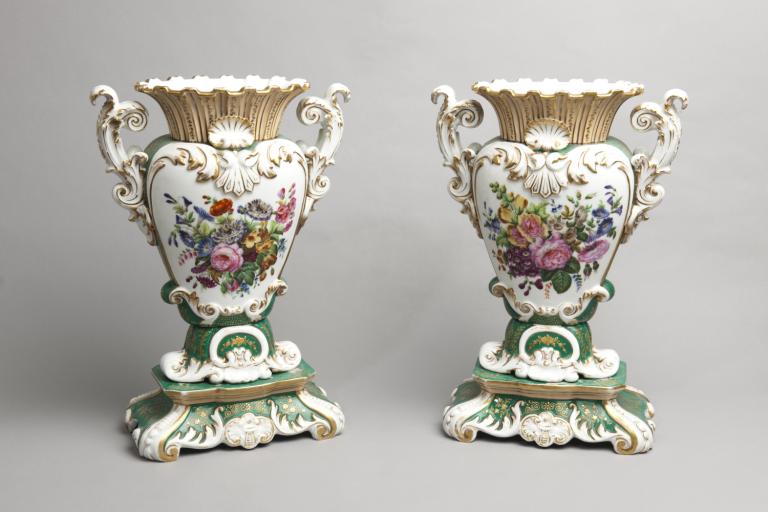 Les vases sont en porcelaine blanche émaillée et dorée à fond vert, constitués de trois parties articulées : corps, col et pied. Les anses prennent la forme de palmettes, les angles du socle sont ornés de volutes.