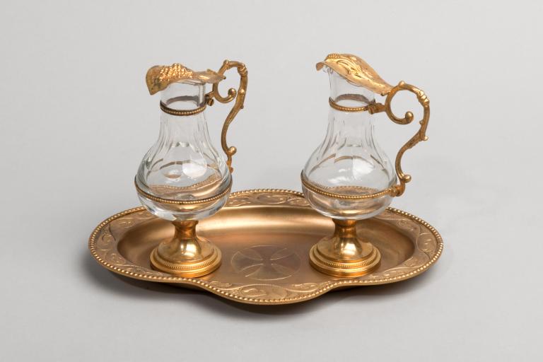 Les deux burettes en verre sont enchâssées dans une monture en cuivre doré, leur panse est cerclée de deux rangs de perles auxquels sont attachées les anses de préhension, au milieu et sous le col. Le bassin est pourvu de deux ergots permettant aux burettes, dont la base est partiellement évidée, de s'y emboîter afin d'en assurer la stabilité.