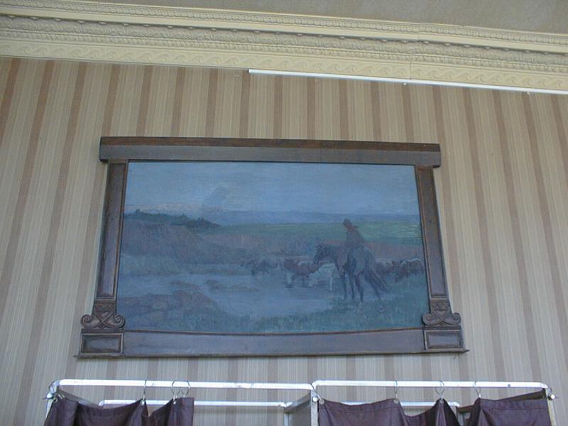 Cette huile sur toile est l'oeuvre du peintre d'origine lorraine Maurice-Sébastien Laurent (1887-1973). Cet élève de l'école des Beaux-Arts de Nancy, où il suit en particulier les cours d'Emile Friant, débute au Salon de 1912 où il obtient une médaille honorifique. Il va alors alterner scène de genre et tableaux régionalistes en faisant souvent preuve d'une esthétique marquée par le Symbolisme. Cette scène animalière participe en effet d'un sentiment symboliste, en particulier dans l'emploi d'une gamme chromatique assourdie et baignant dans des tons de bleus, ce qui renforce l'imprécision de la localisation géographique et temporelle. Ce tableau, daté et signé de 1913, pourrait être celui qui fut présenté au Salon de 1913 et qui avait obtenu le prix Troyon. Ce tableau est acheté en 1916. Le cadre au décor architecturé est très vraisemblablement celui d'origine et pourrait avoir été exécuté par l'artiste lui-même. Le cadre pourrait cependant n'être pas dans sa structure d'origine, semblant avoir été remis à l'envers puisque les chapiteaux des pilastres sont en bas. La toile a peut-être été réencadrée dans le mauvais sens. Portant le numéro d'inventaire FNAC 5349, le tableau est déposé à la mairie le 24 août 1916, à la suite de l'arrêté d'attribution en date du 16 août de la même année.