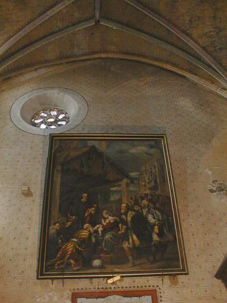 Ce tableau de très grandes dimensions est l'oeuvre du peintre français d'origine toulousaine Pierre Andrieu (1821-1892). Cet élève et collaborateur de Delacroix, qui travailla avec lui à partir de 1844 en particulier à l'hôtel de ville de Paris, au Sénat, à la Chambre des députés, à la chapelle des Anges de saint-Sulpice et restaura le plafond de la galerie d'Apollon au Louvre, a exécuté de nombreux tableaux de genre. Il avait également exécuté un tableau religieux de taille tout aussi impressionnante en 1859, une Sainte Famille, pour une église de l'Isère. Ce dernier tableau était une commande de Napoléon III. Cette Adoration des Mages est une copie d'une fresque du peintre italien Licinio Giovanni Antonio Pordenone (1485-1539). Le tableau est un achat par commande à l'artiste en 1872-1874. L'oeuvre est achevée en 1874, pour un prix de 7000 francs. Ce montant, assez élevé, correspond aux dimensions et à l'ampleur de l'oeuvre. Il s'agit très vraisemblablement de l'une des oeuvres les plus grandes que le FNAC a déposé dans le département du Lot. La date tardive de réalisation dans la carrière de Pierre Andrieu en fait l'une de ses dernières productions picturales. Portant le numéro d'inventaire FNAC PFH-1253, ce tableau est déposé en 1876 dans l'église paroissiale Saint-Maur.