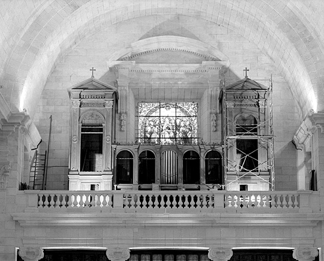 Buffet en sapin composé de 2 corps ou tourelles quadrangulaires (flanquant la fenêtre occidentale de l'église) reliés par un corps central à 5 plates-faces. Pilastres composites entre les plates-faces et aux angles antérieurs des corps latéraux ; frontons triangulaires au sommet des corps latéraux. Composition de la partie instrumentale : grand orgue (Bourdon 16, Flûte 8, Flûte harmonique 8, Salicional 8, Bourdon 8, Flûte octaviante 4, Doublette 2, Plein jeu III rgs, Trompette 8, Clairon 4), récit (Bourdon 8, Viole de gambe 8, Voix céleste 8, Flûte octaviante 4, Nazard 2 2/3, Octavin 2, Tierce 1 3/5, Hautbois 8, Trompette 8), pédale (Contrebasse 16, Basse 8, Bombarde 16, Trompette 8).