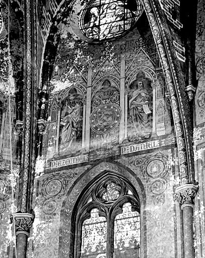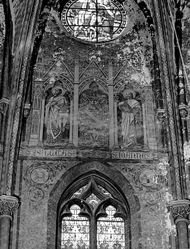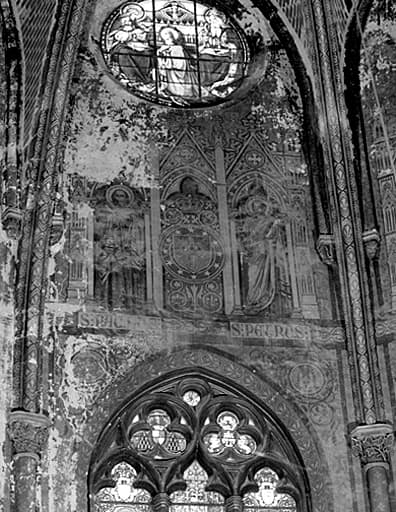 Décor sur trois registres sur les pans du choeur et ses travées droites, frise avec cartouches contenant des inscriptions (chemin de croix, dédicace) sur les murs nord, sud et ouest de la nef, entre les deux niveaux architecturaux ; peinture décorative sur les nervures d'ogives et les colonnettes. Pas de décor dans les chapelles.