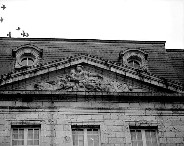 Frontons triangulaires. Un cartouche occupe le centre du fronton est.