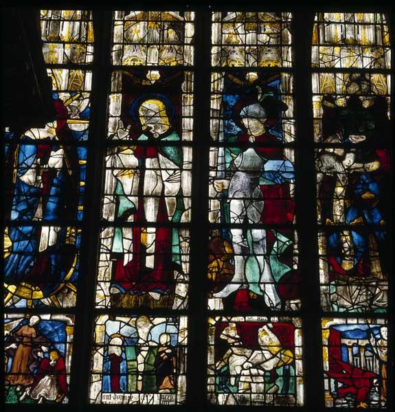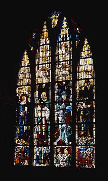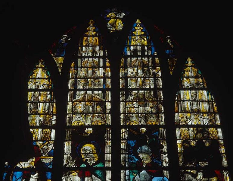 POP | Plateforme ouverte du patrimoineverrière (à personnages, figurée) : Vierge de l'Apocalypse, Assomption, Saint Jean l'Evangéliste, Calvaire, Saint Adrien, Martyre de saint Adrien, saint Denis Céphalophore, Saint Côme, Saint Jean-Baptiste, Saint Damien