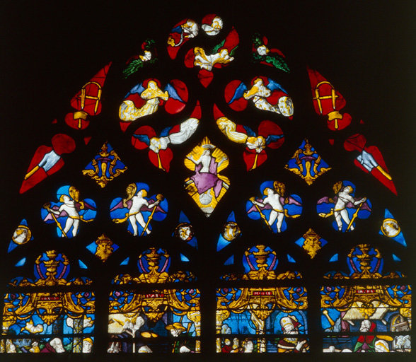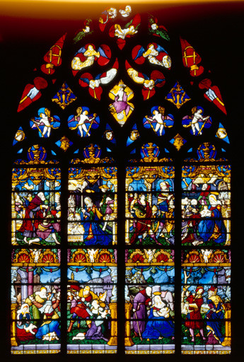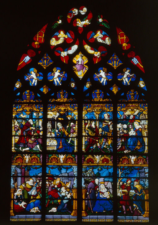 2 registres ; tympan à 25 ajours ; verres gravés dans le panneau de l'Adoration des Mages (registre supérieur)