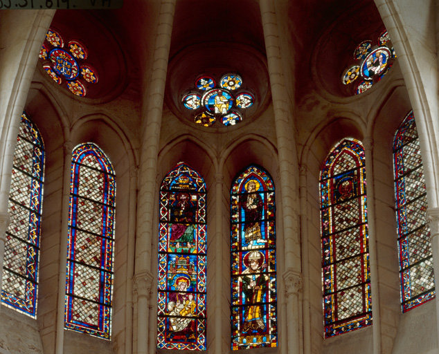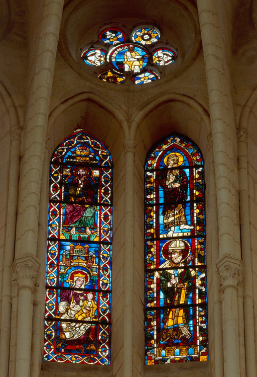 Ensemble très restauré : la bordure et la moitié inférieure du Christ bénissant, la moitié supérieure de la Vierge à l'enfant (baie 100 lancette gauche) ainsi que le tympan de la baie 101 sont du 19e siècle ; les grandes figures debout (baie 100 lancette droite) sont des remplois provenant d'une baie nord ; la tête d'évêque (baie 102, partie supérieure de la lancette gauche) était peut être placée à l'origine dans la lancette droite de la baie 100