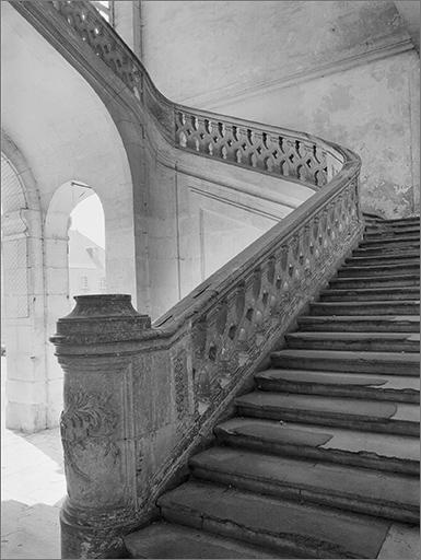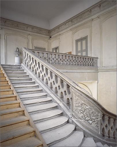 Les rampes d'appui des escaliers nord (corps B) et sud (corps C) ont été sculptées vers 1722-1724 par le sculpteur nancéein Louis Menuet (1689-1755) d'après un modèle fourni par l'architecte Germain Boffrand (AD 54 B1669 : mémoire du 10 mars 1723). Escalier et rampe sud (corps B) détruits durant l'incendie de janvier 2003, restaurés en 2010.