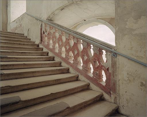 Rampe d'appui à la française à décor d'entrelacs formant losange ; les angles sont ornés d'un panneau rectangulaire sculpté du chiffre du duc Léopold et de feuillage ; le départ de la rampe est sculpté de palmes entrecroisées et de chutes végétales.