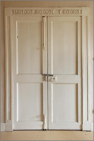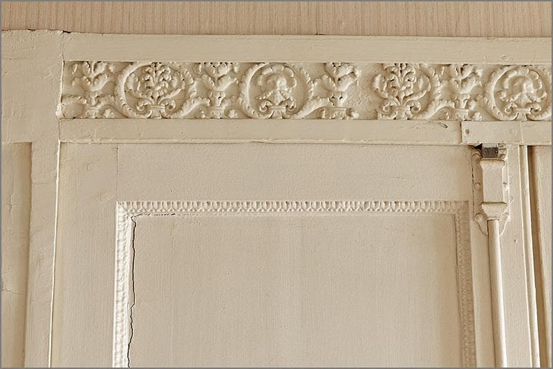 Porte garnie d'une frise de rais de coeur et d'un linteau au motif de cartouches à mascarons et bouquets d'acanthe alternant avec des motifs végétaux