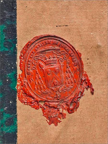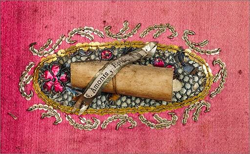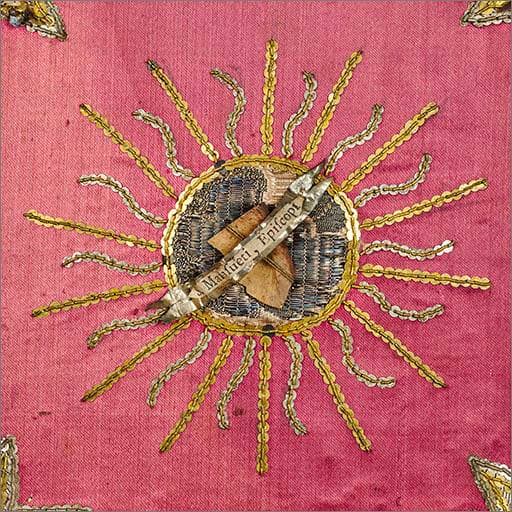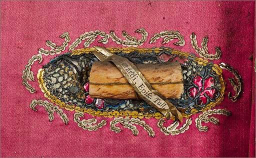 Ensemble de deux tableaux-reliquaires bordés d'un cadre en bois orné de reparures (palmettes sur fond losangé) et doré à la feuille sur bol d'Arménie. Sept reliques (fragments d'os) et des motifs végétaux brodés au fil d'or (avec application de paillons argentés, dorés et rouges) sont disposés sur un fond en soie rouge selon une composition symétrique organisée autour d'un motif central de soleil sur lequel est appliquée la relique de saint Mansuy ; chaque relique, maintenue par une étiquette en papier sur laquelle figure le nom du saint en latin, étant posée sur un élément rapportée de forme étoilée ou ovale (soleil pour saint Mansuy), en tissu (reps de soie blanche pour les étoiles, tissu lamellé pour le coeur du soleil, tulle à l'aiguille pour les ovales) enrichi de perles ou paillon.