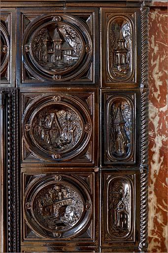 Poêle de chauffage en céramique brun-rouge à chargement par l'avant. Posé sur un socle orné d'un rang de palmettes, et surmonté d'une corniche décorée d'un motif de feuilles d'acanthe, le corps du poêle est formé de carreaux carrés abritant des scènes champêtres (8 motifs différents, se répétant sur tous les carreaux de la même ligne : village avec pont, village avec femme assise, maison forte, chaumière). Les carreaux d'angle, plus étroits, sont également ornés de représentations architecturales. L'ensemble est posé contre un lambris de plaques de marbre veiné rouge.