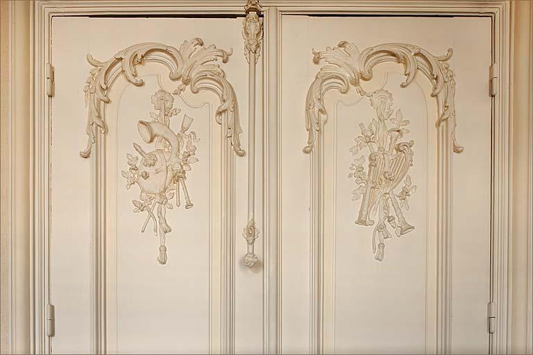 décor de plafond à motif d'ove, de feuilles d'acanthe, de rinceaux végétaux et de bouquet de fleurs ; cheminée à volute, feuilles d'acanthe et pointes de diamant ; porte ornée de chutes d'instruments de musique : cornemuse, harpe, hautbois