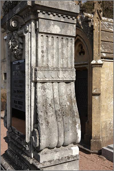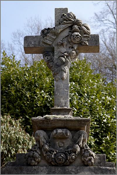 Tombeau en calcaire composé d'un piédestal rectangulaire accosté d'ailerons, posé sur un haut socle et surmonté d'une croix latine. L'ornementation de la stèle est à la fois géométrique et végétale. Localisation dans le cimetière : Section 5 Allée 1 tombeau n°7.