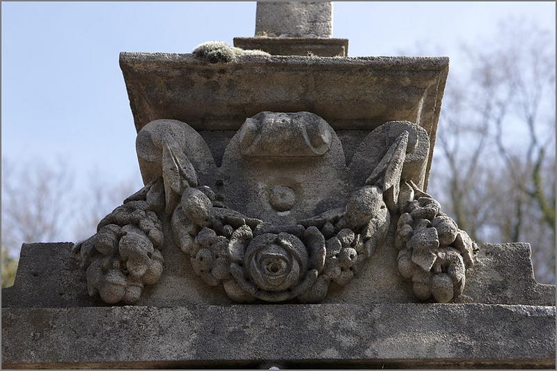 La stèle est accostée d'ailerons cannelés qui se terminent en volute ; au dessus de la plaque de verre portant les noms des défunts, tombe une composition florale avec pavots, roses et pensées. Les angles du cartouche contenant la plaque de verre sont ornés de fleurs stylisées (pensées ?). Le fronton de la stèle est décoré d'une guirlande de fleurs (roses, pavots, pensées, feuillages) servant de socle à la croix. Une branche de rosier en fleur retenu par un ruban orne la croix.