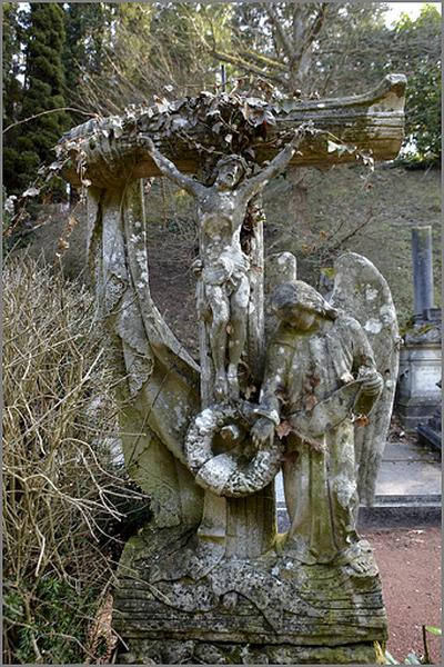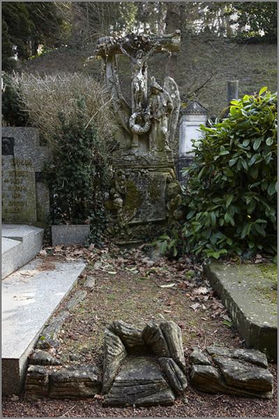 Monument funéraire à l'imitation de la nature, composé d'un piédestal orné d'un amas de pierre et surmonté d'une croix voilée imitant du bois écoté ; à côté du Chrit en croix, se tient un ange pleureur en ronde-bosse qui dépose une couronne mortuaire d'immortelles sur un accroche-couronne sculpté aux pieds du Christ. Le monument est aujourd'hui envahie par la nature (mousse, lierre). Il n'y a pas de dalle, l'espace est limité par un entourage en pierre à l'imitation de roches et une niche faisant office de repose-bougie. Ce monument est l'un des rares de ce cimetière (4 en tout) à comporter une sculpture en ronde-bosse ; il fait partie des 9 monuments à l'imitation de la nature repérés dans ce même cimetière (IM57004825, IM57004830, IM57004834, IM57004835, IM57004836, IM57004824, IM57004846, IM57004853). Localisation dans le cimetière : Section 6 Allée 1 tombeau n°4.