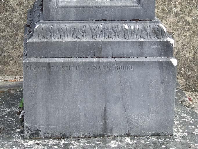 Tombe à stèle rectangulaire d'élévation verticale, en marbre. La base élargie est sculptée dans sa partie haute d'une frise végétale. Le tronc porte le nom des défunts, la corniche est ornée d'une frise sculptée de feuille d'acanthe. La croix sommitale à fût lisse et aux extrémités ornées de couronnes, est entourée d'une chute de lierre, elle repose sur un socle en forme de dôme sculpté de feuille dacanthe.