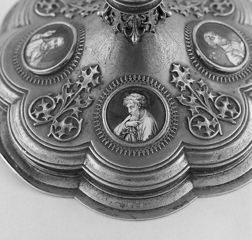 Pied polylobé ; noeud aplati à boutons (cabochons) ; fausse coupe.£Argent amati ; fonte : croix sur couvercle ; ajouré : décor du noeud ; émail peint sur cuivre : médaillons sur coupe et pied ; 4 cabochons sur pied ; assemblage : par vissage ; éléments rapportés : soudés