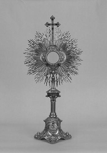 Ostensoir offert en 1861 par le comte de _CAUSANS et sa femme née _HOVELT, à la suite d'un voeu de Monsieur Armand _HOVELT ; exécuté à Lyon entre 1853, date vers laquelle le poinçon d'Armand-Calliat est insculpé, et 1861.
