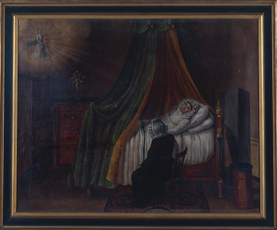 Description : dans une chambre meublée d'un chiffonnier, d'une table de nuit cylindrique et d'un paravent, une femme malade est allongée dans un lit à dais : une femme vêtue de noir et portant une coiffe la veille ; dans l'angle supérieur gauche, une Vierge à l'Enfant.