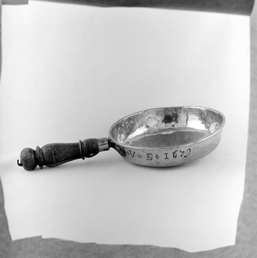 Le récipient en laiton est de forme circulaire. Le manche est en bois tourné avec soie en fer.