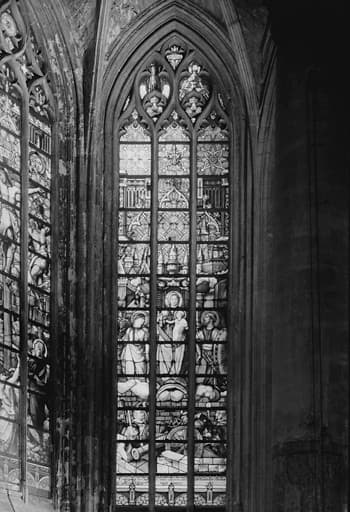 verrière de style néo-gothique : Vierge à l'enfant, sainte Barbe et saint Maurice protégeant la ville de Lille et ses défenseurs (baie 2)