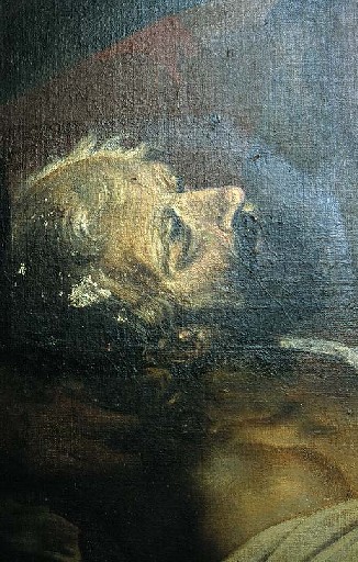 Toile sale avec écaillage de la couche picturale et déchirure.