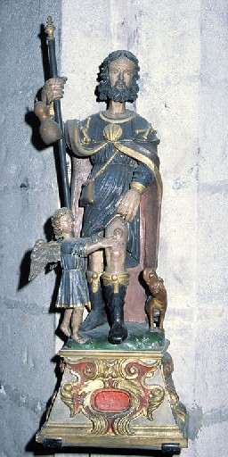 saint Roch : en pied, barbe, attribut : pèlerin, chapeau, sac, bâton, récipient, maladie : peste, ange : toucher, chien : pain ; ornementation (à coquille, à cartouche, à rinceaux, à volute)