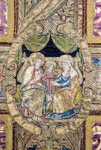 tissu façonné : damas (violet) ; soie : brodé, lin (?)
