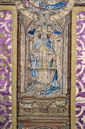 Cette chasuble a été réalisée avec pour tissu de fond un damas de soie violet rehaussé de fils d'or. Le décor se développe sur de larges bandes brodées. La doublure est faite de tissu également violet.