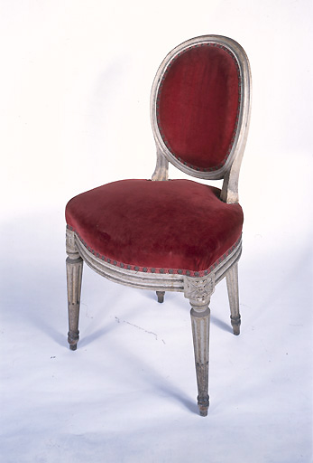 Les chaises sont composées d'un dossier ovale concave avec une traverse verticale, d'une assise et de quatre pieds cannelés rudentés. Les éléments de menuiserie ont été réalisés en hêtre peint en blanc sur apprêt. La garniture de l'assise et du dossier est en velours de coton rouge.