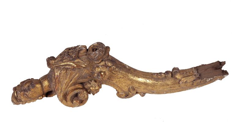 L'extrémité de l'élément présente une figure féminine en espagnolette vêtue à l'antique. L'élément comprend aussi quelques fleurs en relief.
