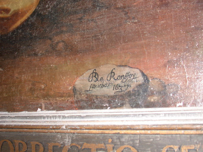 Signature en latin peinte sur un rocher dans la partie inférieure du tableau : R DE RONSSOY FACIEBAT ; la date est elle aussi inscrite sur le rocher : 1637.Inscription en latin peinte sur le bord inférieur du cadre : IUSTITIA ET IUDICIUM CORRECTIS SEDIS EIUS. Ps. 96 = "La justice et l'équité sont la base de son trône".