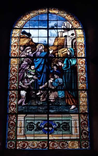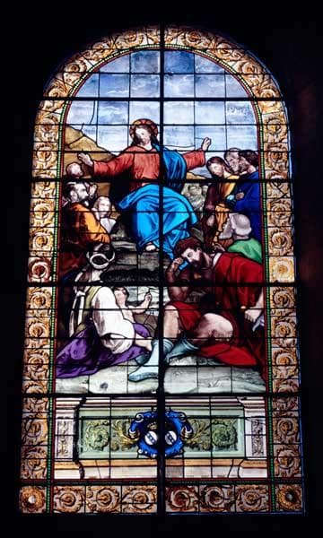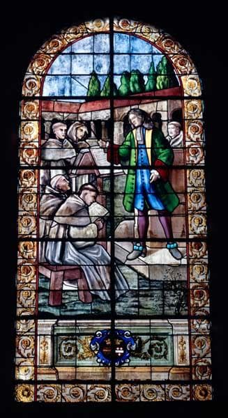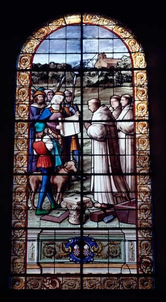 ensemble de 8 verrières (hagiographiques et décoratives) : Jésus bénissant les enfants, Enseignement du Christ, la Leçon de musique d'Henry Du Mont, Fondation de l'abbaye de Silly