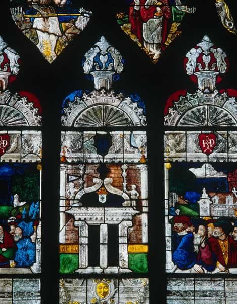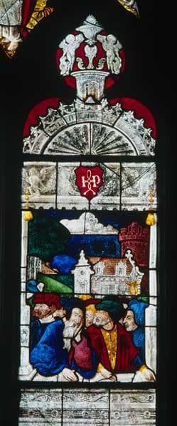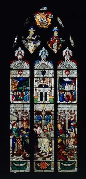 verrière hagiographique : Salomé portant la tête de saint Jean-Baptiste, danse de Salomé devant Hérode Antipas, supplice de saint Jean l'Evangéliste