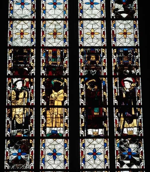 verrière hagiographique : saint Latuin, saint Gervais, saint Protais, saint Chrodegand, sainte Anne, Vierge