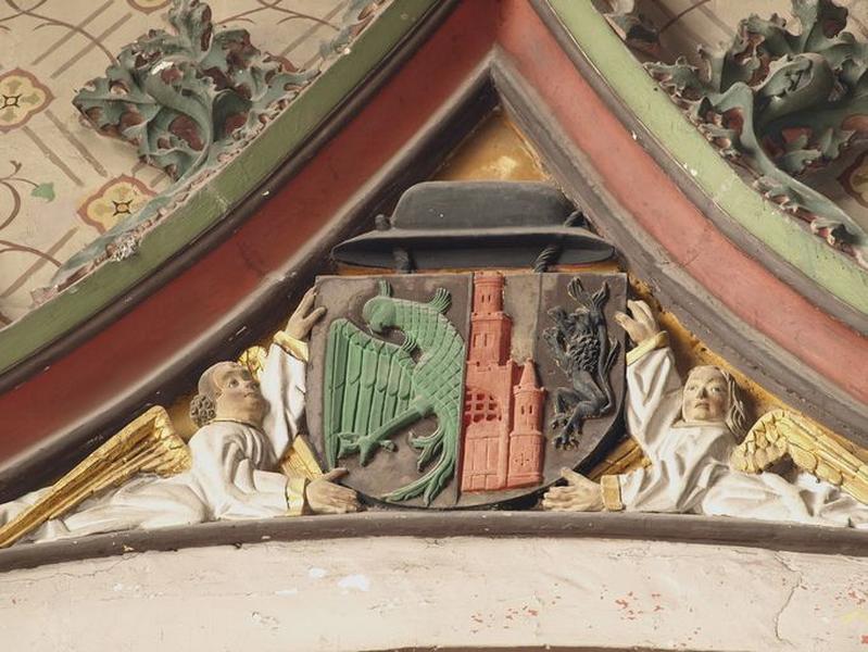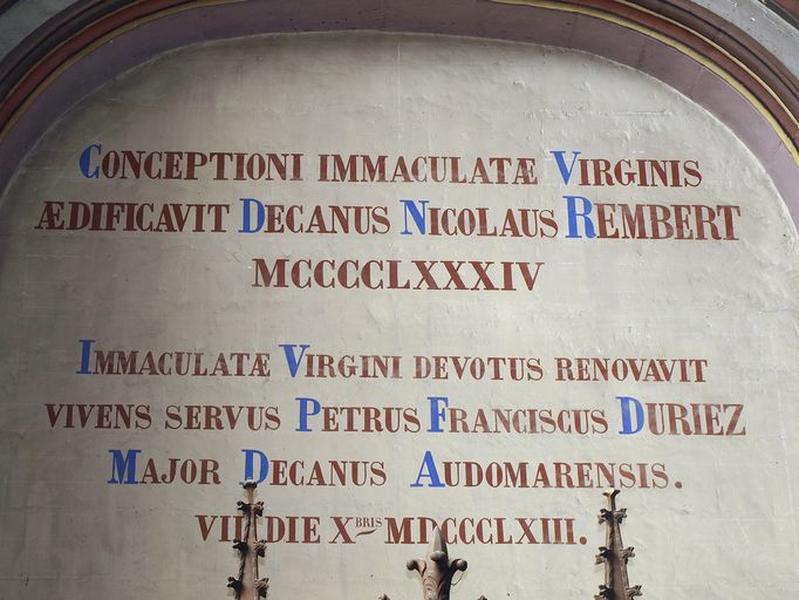 Armes placées au sommet : blason d'or à un chatelet de gueules accosté de deux lions affrontés de sable, et au-dessous un autre blason placé sous un chapeau sans houppes, parti au 1 à l'aigle au chef parti de sinople ; au 2 semblable à l'écu précédent.£Dans l'inscription on retrouve les initiales de Nicolas Rembert (décédé en 1503) et de François Duriez, Doyen de Saint-Omer (décédé en 1863).