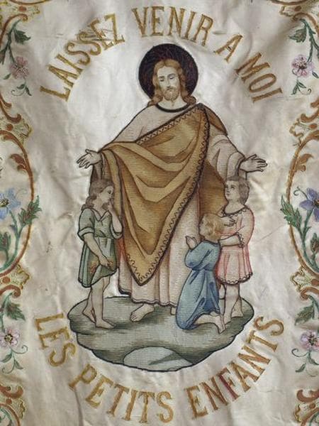 Bannière de procession de l'oeuvre des catéchistes volontaires de la paroisse du Saint-Sépulcre (Jésus bénissant les enfants)