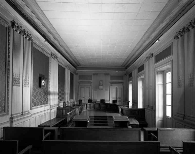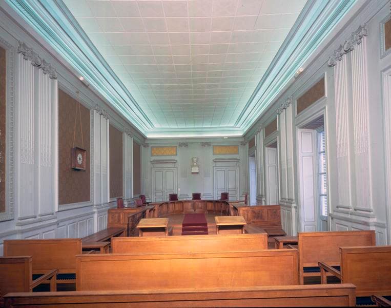Ensemble du mobilier de salle d'audience : estrade, garde-corps, 6 tables, 2 pupitres, 9 banquettes