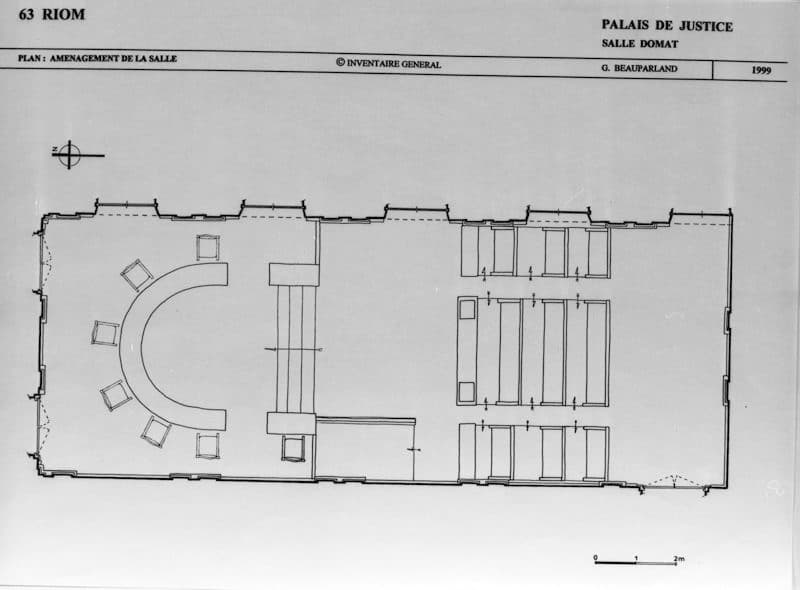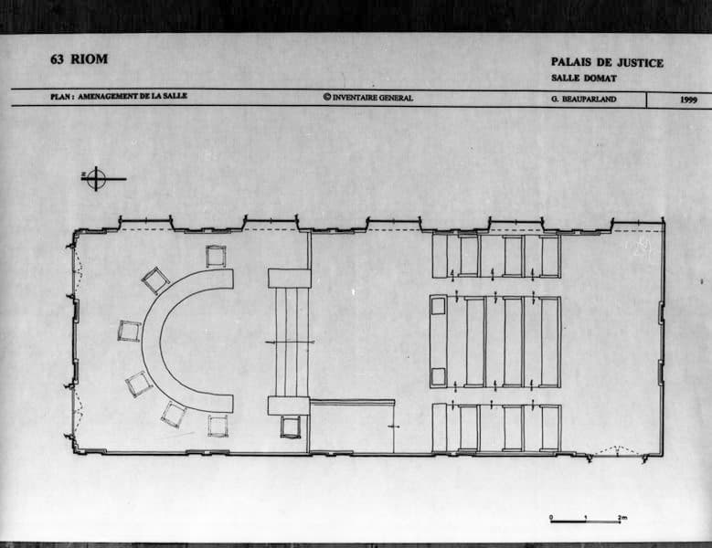 POP | Plateforme ouverte du patrimoineEnsemble du mobilier de salle d'audience : estrade, garde-corps, 6 tables, 2 pupitres, 9 banquettes