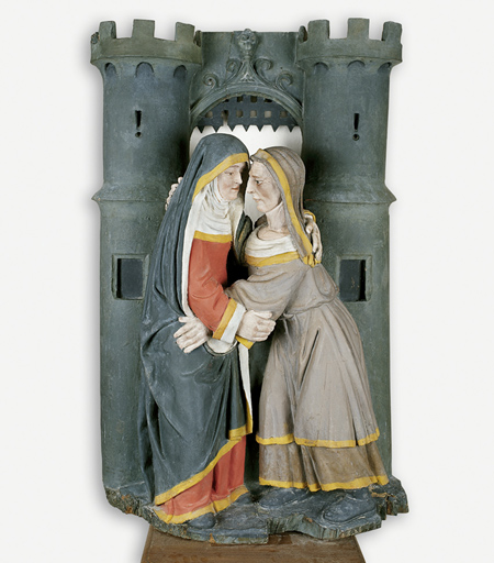 Ce haut-relief taillé dans un bois feuillu difficilement identifiable (noyer ?), est vraisemblablement un fragment d'un retable démantelé. La sculpture assez fruste relève de l'art populaire et est difficile à dater. Cependant, l'arc en accolade de la porte, orné de crochets, ainsi que les chaussures rondes, plaident pour le début du XVIe siècle. La scène de la Visitation est placée devant la porte fortifiée d'une ville. Il y a là un bon exemple de contamination d'un thème iconographique par un autre : ce détail est d'ordinaire associé à la rencontre d'Anne et Joachim devant la Porte dorée, et non à celle de Marie et d'Élisabeth placée d'ordinaire dans un cadre domestique.