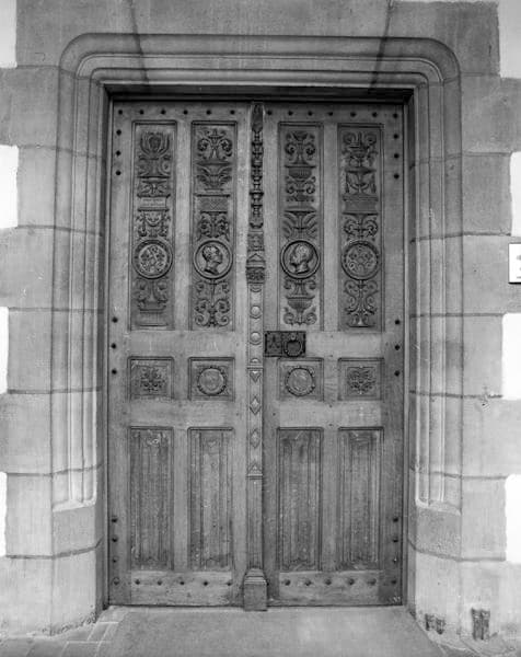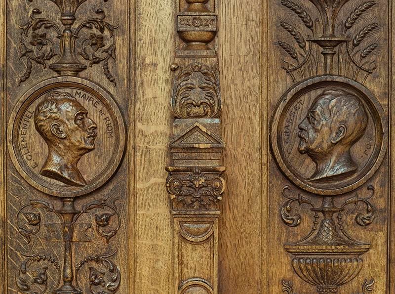 Porte à décor sculpté néo-Renaissance et portraits de profil dans des médaillons : Etienne Clémentel, maire de Riom et Edmond-Marius Grasset, premier adjoint.