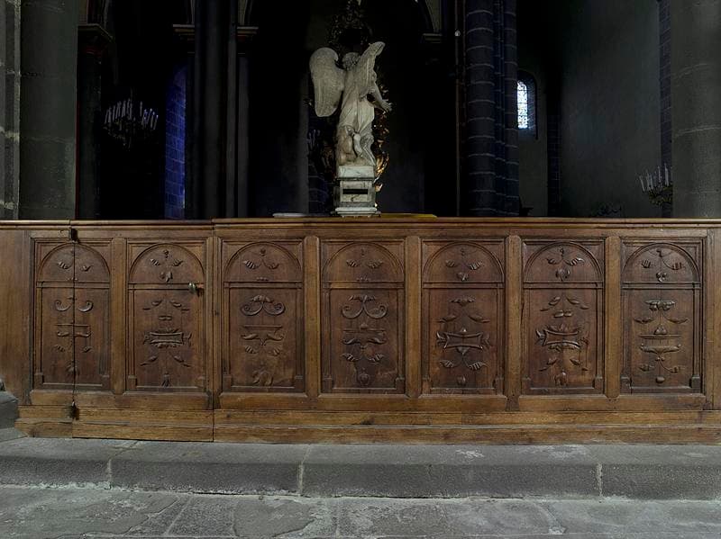 Sept panneaux en réemploi en revers des stalles au nord sont peut-être des vestiges d'un premier ensemble de stalles. L'ensemble postérieur des stalles et de leurs dorsaux a été démembré. Les stalles subsistent dans le choeur (elles ont été regroupées ou certaines ont disparu) et les dorsaux ont été remontés en lambris de revêtement dans la sacristie.