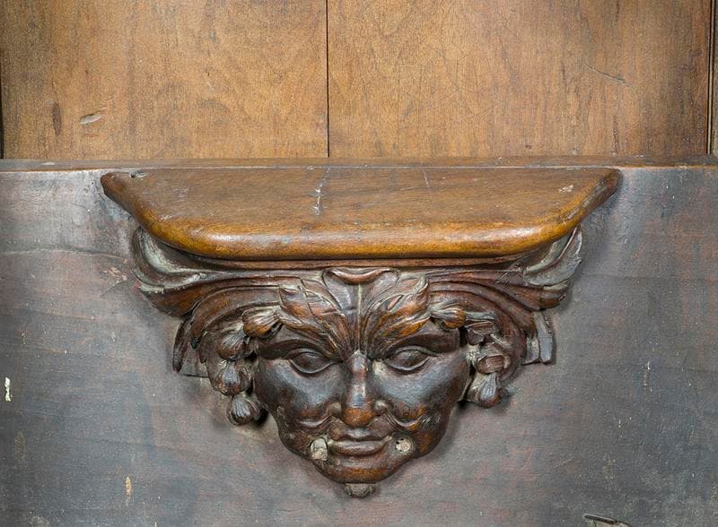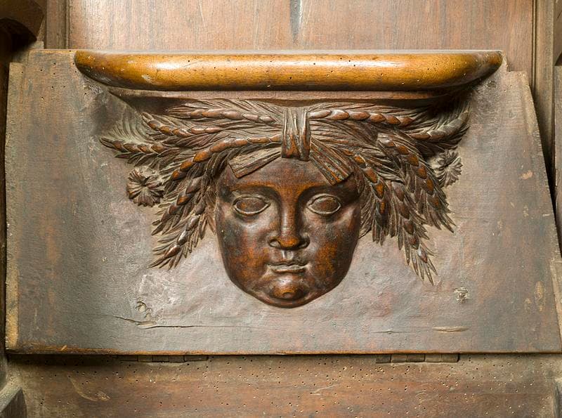 saint Amable ; saint Bénigne ; ange ; chute végétale ; tulipe ; rose ; raisin ; blé ; mascaron ; masque feuillu ; feuille de chêne ; gland de chêne ; rameau d'olivier ; cerf ; bouc