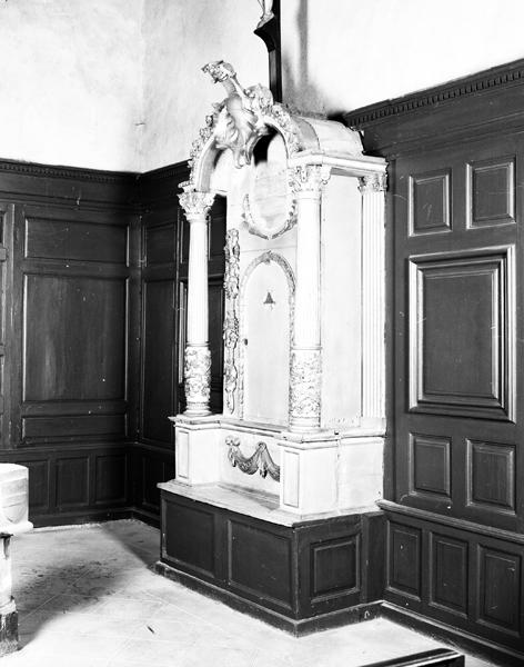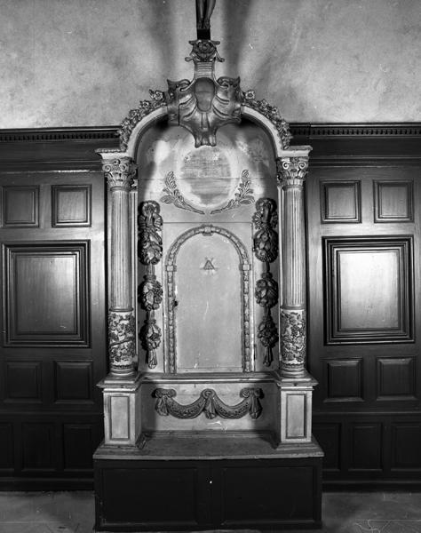 meuble architecturé à colonnes cannelées. Au dessus de la porte centrale est un tondo contenant une toile peinte, inscrit dans un fronton curviligne souligné d'une bordure sculptée