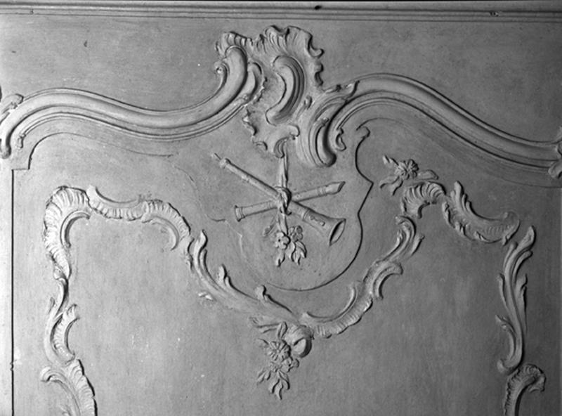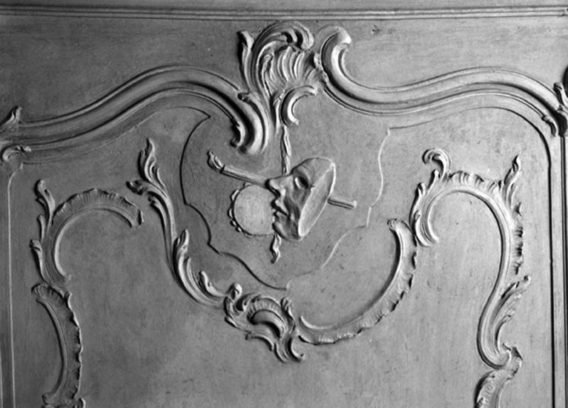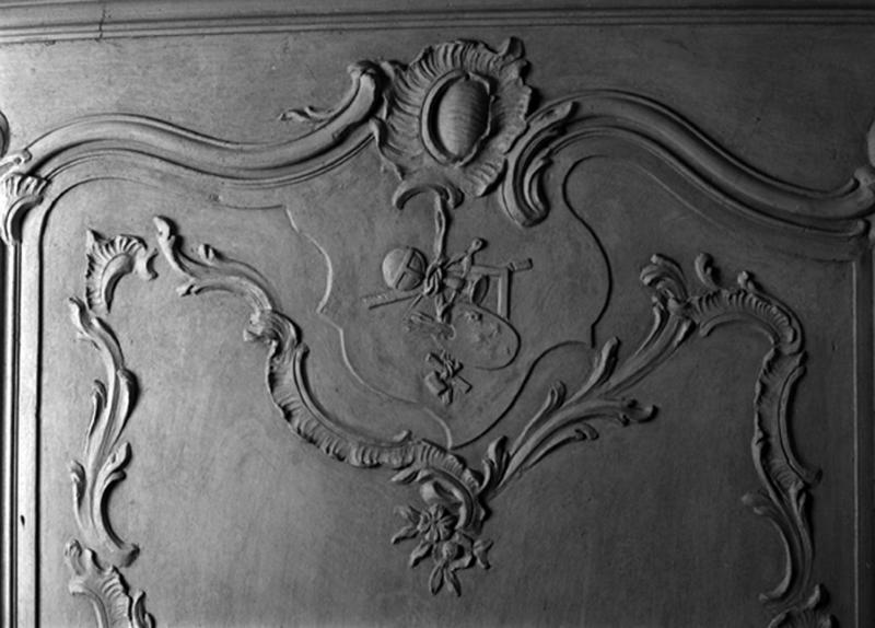 trophée : instrument de musique ( tambour, drapeau) ; trophée : instrument de musique (masque ; tambourin) trophée : instrument de musique (lyre ; flûte ; flûte de pan ; hautbois ; partition) ; chute végétale ; trophée : instruments de musique (flûte, hautbois) ; trophée : instrument de musique (violon, partition) ; trophée (équerre, compas, palette, burin, marteau, pinceau, globe terrestre) ; trophée : vigne (râteau, pioche, grappe de raisin) ; cartouche rocaille : couple (oiseau)