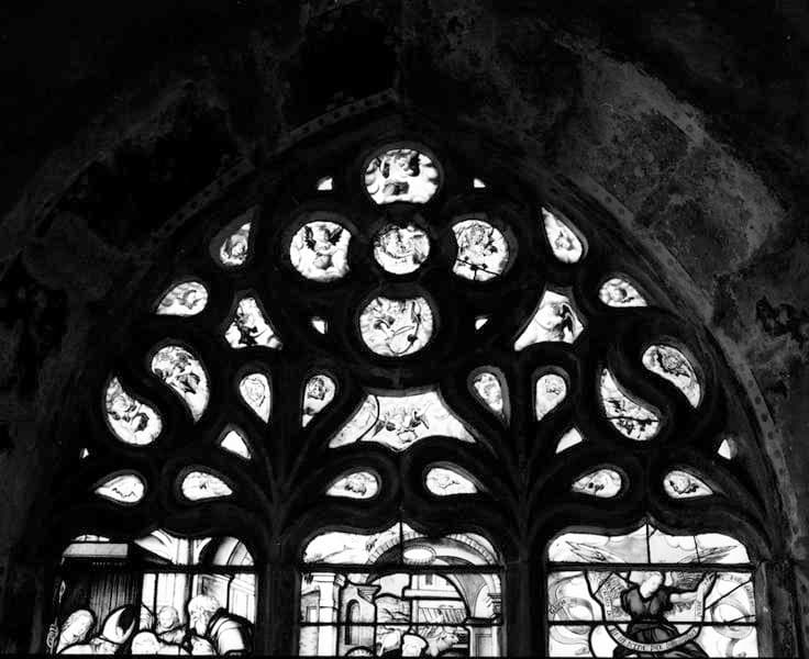 verrière : Purification, Adoration des Mages, Annonce aux bergers ; membres de la famille de La Barge