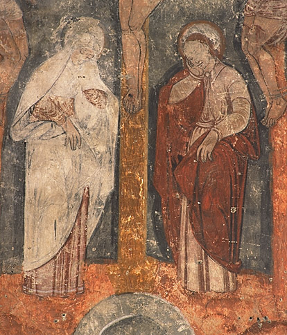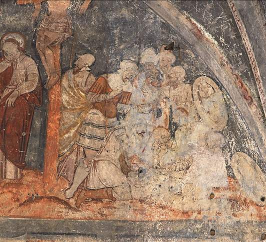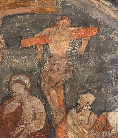 1ère peinture, mur ouest : Cène couronnant l'ensemble de la peinture, lavement de pieds (registre médian gauche), Agonie du Christ (registre médian droit), Baiser de Judas (registre inférieur gauche) ; 2ème peinture, mur Nord ouest : 1 seul panneau lisible en bas à gauche, la Flagellation du Christ ; 3ème peinture, mur Nord est : Pilate se lave les mains (registre inférieur gauche), Montée au Calvaire (registre inférieur droit), Descente de Croix (registre médian droit), Mise au tombeau (registre médian gauche), Dieu le Père (registre supérieur)